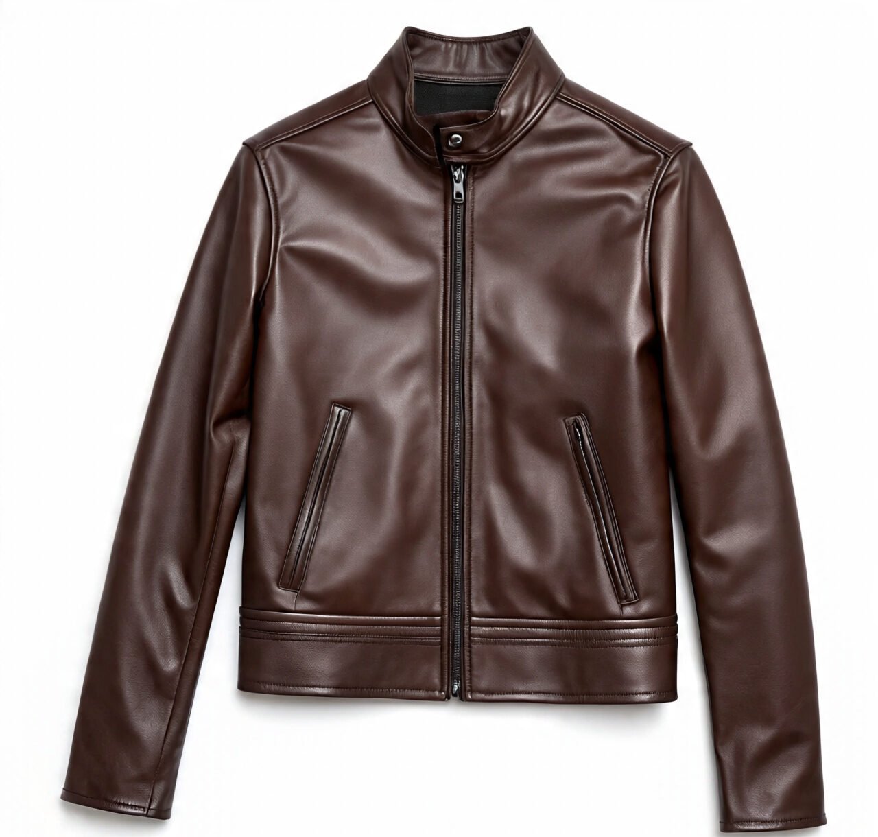 The jacket features a minimalist stand-up collar with a snap button for a secure fit and wind protection. Two vertical chest pockets and side pockets offer practicality without compromising the sleek silhouette. Whether you are riding through the city or heading to a business casual meeting, this jacket offers the perfect blend of warmth, comfort, and luxury.